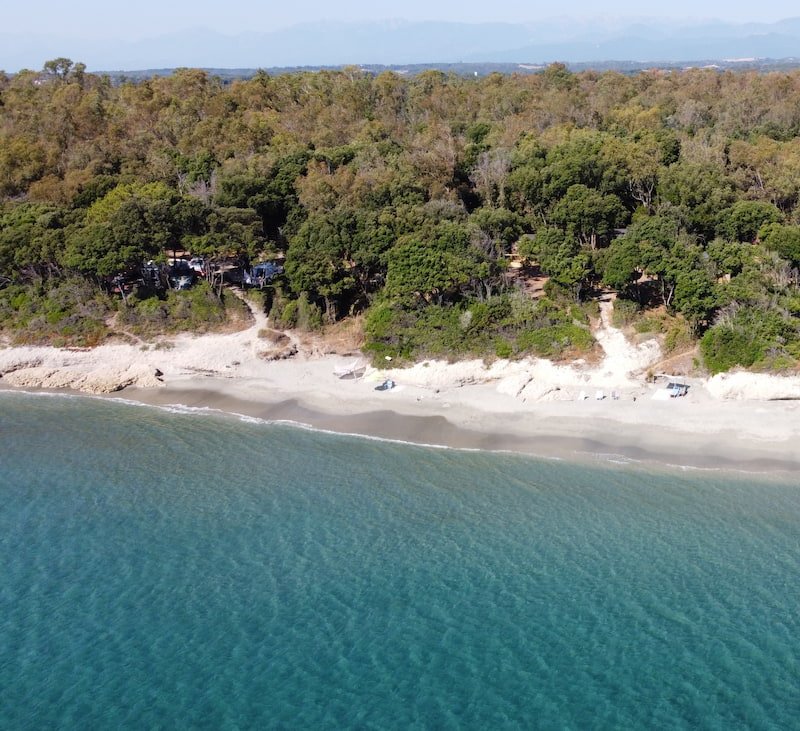 Le camping s’inscrit dans un paysage typique de la côte orientale corse, entre maquis, pins maritimes et oliviers. Cette végétation apporte ombre, senteurs et ruptures naturelles entre certaines zones d’hébergements. Elle participe à la sensation d’immersion en pleine nature, loin de l’urbanisation dense. Ce décor favorise la déconnexion, la marche tranquille et l’observation des paysages marins. Il renforce la cohérence entre naturisme, nature et douceur de vivre méditerranéenne.
